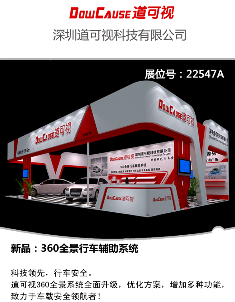 2015年1月16日,第十一屆深圳國(guó)際汽車改裝服務(wù)業(yè)展覽會(huì)盛大開幕,迎來了國(guó)內(nèi)各地的參展商和采購(gòu)商。深圳道可視科技有限公司精心準(zhǔn)備的各種展品在展會(huì)現(xiàn)場(chǎng)獲得了市民以及采購(gòu)商的一致好評(píng)。特別是我們的360度全景泊車影像系統(tǒng)備受關(guān)注,受到了各界人士的駐足。這一次我們主要的展品有360度全景泊車影像系統(tǒng)、智能倒車軌跡、專車專用攝像頭。這三類展品是我們公司專門針對(duì)汽車電子行業(yè)設(shè)計(jì)生產(chǎn)的主打產(chǎn)品,不僅在國(guó)內(nèi)屬于獨(dú)創(chuàng),在國(guó)際上也是具有較強(qiáng)競(jìng)爭(zhēng)力。