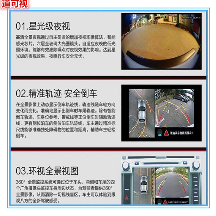 道可視1080P超清版360度全景行車輔助系統(tǒng)擁有更高的清晰度;軌跡線誤差小于5厘米;6大行車輔助功能,讓你行車更安全。我想大家不愿意遇到的就是當(dāng)有些強行變道剮蹭到自己愛車后逃之夭夭,原本以為行車記錄儀可以拍攝到車牌號碼,結(jié)果取證時卻發(fā)現(xiàn)只剩一片模糊...分辨率低、夜晚拍攝能力差,取景角度太小這些問題一直都是不正規(guī)行車記錄儀為常見的問題,貪一時便宜有時候損失可是相當(dāng)大的。