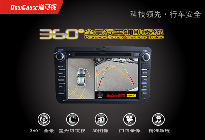 道可視360全景影像系統(tǒng)通過前后左右的四路攝像頭采集四周圖像,經(jīng)過無縫拼接后在原車屏實(shí)時(shí)形成360度全景俯視圖和前后左右的單視圖。車主可以清晰直觀的掌握周邊路況,不留一線視野盲區(qū),將一切盲區(qū)交通事故扼殺在發(fā)生之前。