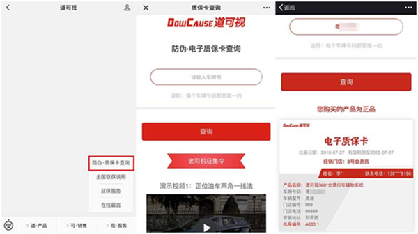 汲取在產(chǎn)品銷售與售后服務(wù)上的經(jīng)驗(yàn)積累,道可視在售后服務(wù)上不僅擁有一套標(biāo)準(zhǔn)化的操作流程,還推出“電子質(zhì)?!と珖?guó)聯(lián)?!钡氖酆笳?。每個(gè)購(gòu)買過(guò)道可視產(chǎn)品的消費(fèi)者,都會(huì)獲得一張道可視“電子質(zhì)保卡”,這張電子質(zhì)保卡是道可視產(chǎn)品的真?zhèn)尾樵儜{證,也是集產(chǎn)品信息、門店信息與用戶信息于一體的售后資格憑證。