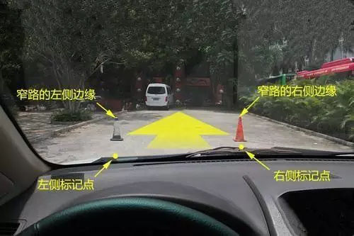 車主可以在距離窄道還有 8-10 米的距離,車身筆直對著窄道的情況下,車主可以設(shè)定兩個用于判斷距離的點(diǎn),一般情況下是窄道的兩側(cè)邊緣對應(yīng)著擋風(fēng)玻璃下的某個位置。