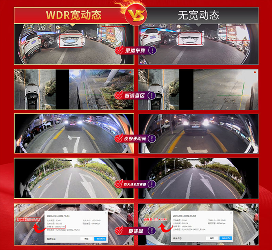 在實測中,我們將有WDR和無WDR的視頻做了對比,對比發(fā)現(xiàn),有WDR的視頻里,車牌更清晰,盲區(qū)更清晰,夜晚更明亮,畫質(zhì)更細(xì)膩,有效地解決了生活中攝像頭遇到汽車大燈等強(qiáng)光時,畫面曝光、眩光等問題。