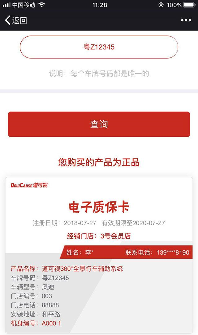 同時,用戶可以直接查詢到安裝的產(chǎn)品是否為道可視正品360°全景環(huán)視系統(tǒng)產(chǎn)品,杜絕偽冒產(chǎn)品。
